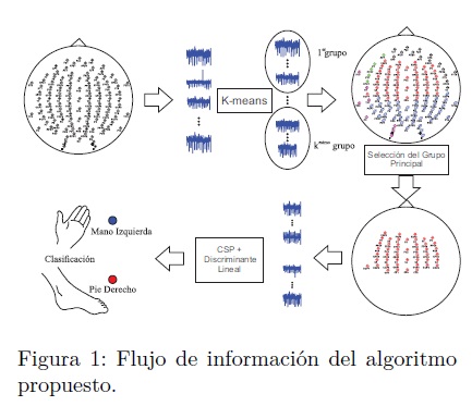 Los datos iniciales son una matriz de datos que representa las señales provenientes de 118 electrodos de un EEG. Esta información se agrupa mediante el algoritmo k-means utilizando la métrica de correlación. En cada grupo se mide la correlación intra-grupo y posteriormente se selecciona el grupo cuya correlación es mayor, reduciendo la cantidad de información procesada de 118 a 35 electrodos. Finalmente, las señales de los electrodos de este grupo son los datos de entrada a la etapa de clasificación de imaginación del movimiento mano izquierda vs pie derecho. Para esta etapa de clasificación primero se aplica el método CSP para proyectar los datos en un espacio de dimensión menor donde las clases son más fácilmente separables y posteriormente se aplica un discriminante lineal para distinguir los eventos de imaginación motora.