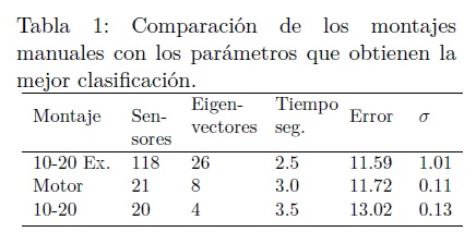 La tabla 1 muestra los errores de clasificación para las tres configuraciones manuales con sus desviaciones estándar respectivas. Observe que la mejor configuración es la correspondiente al estándar 10-20 extendido de 118 electrodos con un índice de clasificación del 88.4% seguida por la configuración central de 21 electrodos que alcanza el 88.27% de clasificación. Mientras que la configuración del 10-20 únicamente alcanza 86.98 %.