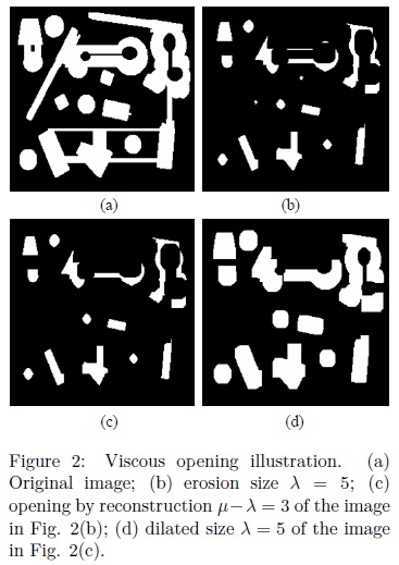 Viscous opening and closing utilize the parameters λ and μ. The ελ(f) and δλ(f) are used to detect those components that can be separated. To illustrate this situation consider the image in Fig. 2. Original image is presented in Fig. 2(a). In Fig. 2(b), the erosion size λ = 5 disconnects chained components; posteriorly in Fig. 2(c) the opening by reconstruction eliminates the components of size minor than μ λ = 3 while the remaining components are maintained unchanged. Finally, in Fig. 2(d) the dilated image with λ = 5 recover the size of the original components but now they are disconnected. The components that do not support the erosion and the opening by reconstruction are merged with the background.
