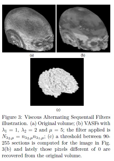The VASFs will be used to segment some regions of interest. The segmentation process consist in flat the maxima and minima iteratively through the viscous opening and closing. At the end with a threshold is posible to recover the flatened zones under study. Fig. 3 illustrates the performance of Nλn,μ. Notice that, the brain has been completely separated.