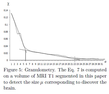 where vol represents the volume of f, i.e., the sum of all intensity levels into the image. Figure 5 presents a granulometric study applied on a volume of MRI T1 segmented in this paper. Notice in this figure that, for sizes of μ between 1-5 the openings detect a component corresponding to the skull while openings between sizes μ in the interval 5-21 detect an important presence of the brain. From this analysis, appropiated sizes of μ to detect the marker of the brain using the morphological opening are within the interval μ ∈ [6, 22].