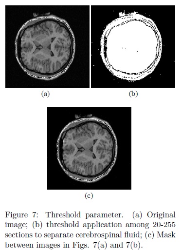 ii. The parameter Th1 represents a threshold used to eliminate cerebrospinal fluid with the purpose of disconnecting several regions between the brain and skull. According to the results presented in 20, the cerebrospinal fluid is eliminated with threshold values among 20-255 sections. Fig. 7 illustrates this situation. Original image is located in Fig. 7(a), whilst the threshold among 20-255 sections is presented in Fig. 7(b). Notice that, several components among the brain and the skull have been merged with the background, while the remaining regions are maintained unchanged. In Fig. 7(c) it is presented a mask between the original image (7(a)) and the image in Fig. 7(b). The image in Fig. 7(c) is convenient during the processing because when the leveling transformation reaches the regions where cerebrospinal fluid was located (dark regions); the propagation of the marker will be slower, obtaining in this way almost the separated brain with the leveling transformation.