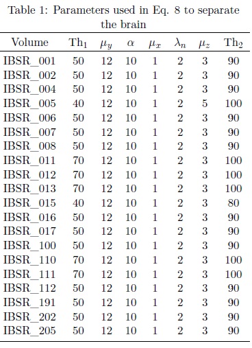 In this paper, 20 MRIs T1 (denoted as IBSR) of the head taken from the Centre for Morphometric Analysis (CMA) at the Massachusetts General Hospital (http://www.nitrc.org)[3] are processed with Eq. 8. The parameters utilized to separate the brain are shown in Table 1. From Table 1 next comments are presented: