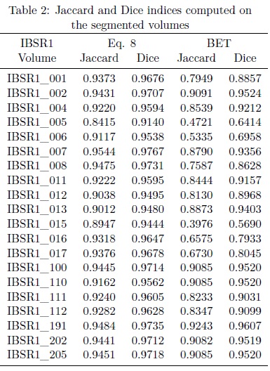 In Fig. 9 some output images belonging to the volume IBSR_7 (see Fig. 9(a)) and processed with the algorithm aforementioned are exhibited, see Fig. 9(c). In order to compare our results, the Jaccard and Dice indices are computed on: i) manual segmentations obtained from the IBSR volumes, and ii) segmentations obtained from the BET algorithm implemented in the MRicro software with default parameters.