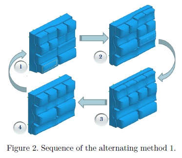 A) Alternating strategy 1: This sequence is based on the common strategies of dual commercial cushions[13] with a variant in the cycle characteristics of inflating and deflating sequence. This strategy is realized in four phases as shown in figure 2 where three sections of the cushion are inflated at a maximum inner pressure of 37 mmHg while the other three are deflated at a minimum inner pressure of 32 mmHg. It is continuously alternated over all the supporting area. Each cycle of 4 phases lasts about 30 seconds.