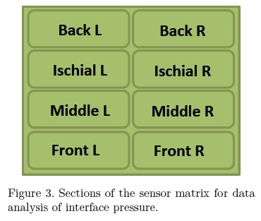 To evaluate the pressure redistribution during the application of alternating strategy, the entire map given by CONFORMat was divided into 8 sections, 4 sections on the right side and 4 sections on the left side, Figure 3. For each section, coefficient of variation (CV) of interface pressure was computed for 2 minutes on static sitting defined as 'Baseline' and the last 2 minute recordings during the 10 minutes of the alternating sequence. Coefficient of variation is the ratio between standard deviation SD to the Mean as shown in equation 1.