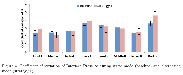 Where CVAlt is the coefficient of variation of the alternating phase, and CVstc is the coefficient of variation of the static phase or baseline. Positive values indicate that the coefficient of variation was higher on the alternating strategy, and negative values indicate that the static phase was higher compared with the alternating method. The highest increase of variation among the strategies indicates larger alternation of pressure on the seating areas.