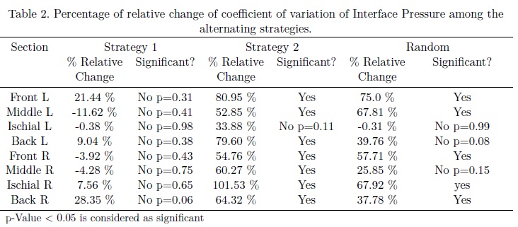The percentages of increasing of CV from the three alternating methods and the significant changes after applying the strategies are summarized in Table 2. Negative values observed in some sections suggest that there was a decrease of variation of interface pressure after applying the method. As observed in Table 2, alternating strategy 2 showed the greatest percentage of increasing of variation and also obtained the higher number of sections with significant differences between static and alternating modes which is the best response compared with the other alternating strategies.