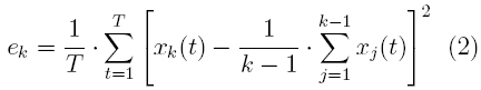 Sea xk la señal Doppler de flujo sanguíneo obtenida en el intervalo k(k ≥ 2) por un transductor, con señal determinística y que porta la información útil D(t), ruido continuo ni,k y nf,k de potencias respectivas Pi,k y Pf,k y ruido eventual na,k de potencia Pa,k. El error cuadrático medio entre el k-ésimo ciclo y el promedio de los anteriores (con T muestras cada uno), será: