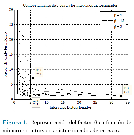Con el objetivo de controlar la varianza de las distorsiones debidas a las variaciones naturales del sistema cardiovascular, se introduce el parámetro β, denominado factor de ruido fisiológico. Al tener en cuenta este nuevo parámetro en el valor esperado del error cuadrático medio cuando no existen distorsiones eventuales (expresión (9)), y en función de la varianza de las componentes del ruido continuo que es posible estimar, se tiene que: