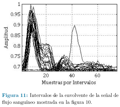 Se debe notar de la figura 11 que existen intervalos en la señal que exhiben un comportamiento diferente al del resto y cualquier información extraída de ellos no presentará utilidad clínica alguna. Esto es un indicador de que dichos ciclos han sido afectados por ruido eventual. Lo más conveniente sería la exclusión de los mismos durante el análisis de la señal con el objetivo de emitir un diagnóstico seguro sobre el estado del vaso sanguíneo injertado.