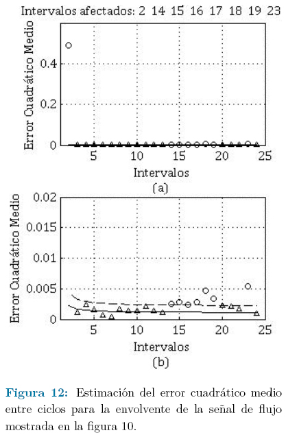 Como se puede observar en la figura 12 han sido detectados 8 intervalos como afectados por ruido eventual, los cuales han sido marcados con círculos. En la figura 12b se distingue claramente la diferencia que existe en el error cuadrático medio entre los ciclos no distorsionados y los distorsionados.