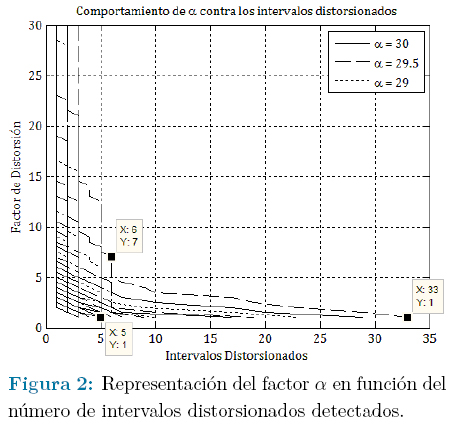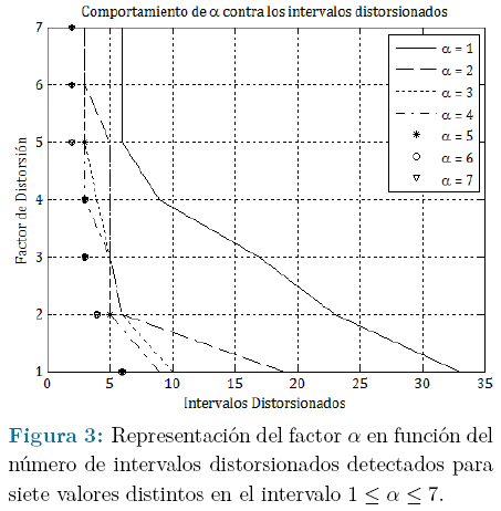 Para todos los casos, la máxima cantidad de intervalos distorsionados que serán detectados dependerá del propio valor utilizado; por ejemplo, para α = 1 esta cantidad es 33, para α = 2 es 19, para α = 3 es 10, para α = 4 es 9 y 6 para α = 5, α = 6 y α = 7. Esto demuestra que utilizar los valores en el intervalo 5 ≤ α ≤ 7 disminuirá en aproximadamente 27 (de 33 a 6) el número máximo de ciclos afectados por ruido eventual que es posible detectar. Esto hace que el intervalo de valores para α pueda ser reajustado de 1 ≤ α ≤ 7 a 1 ≤ α < 5.