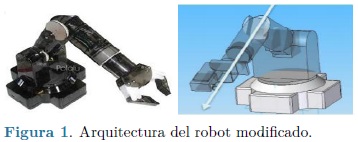 Se escogió para este proyecto el brazo robótico de entrenamiento modelo OWI 0C7[8]. Este brazo sobresale por su bajo costo (alrededor de 100 dólares), cuenta con 4 articulaciones y un gripper tipo pinza. Sin embargo no cuenta con sensores de posición, y sus 4 articulaciones no le proporcionan Codos los movimientos necesarios para el posicionamiento de la guía. Por tal motivo la primera modificación realizada consistió en cambiar la pinza por una articulación adicional, donde se ubicó el anillo guía, para el tornillo a insertar. La segunda modificación radicó en colocar potenciómetros lineales como sensores de posición en cada articulación, dado que los motores originales no vienen con este tipo de sensores. La Figura 1 muestra el robot comercial utilizado y el CAD del mismo con la modificación en su órgano terminal.