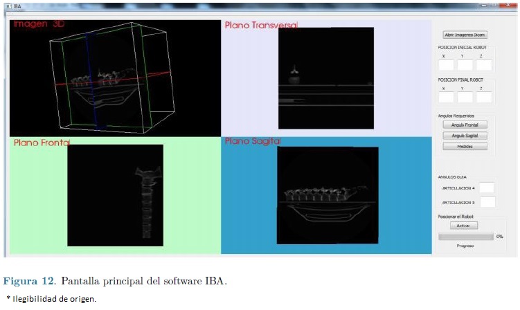 El software diseñado lleva por nombre IBA (Ingeniería Biomédica Aplicada). El programa se desarrolló en VTK (motor gráfico de código abierto) [14], y es compilado en C++ sobre la plataforma Visual Studio 2010. La interfaz de usuario como íconos, botones, y ventanas fueron desarrollados en Qt (software de código abierto) [15]. Las imágenes empleadas se encuentran en formato Dicom (Digital Imaging and Communication in Medicine). Este formato es el estándar reconocido mundialmente para el intercambio de imágenes médicas, diseñado para la visualización, almacenamiento, impresión y transmisión de ellas. Un objeto DICOM simple puede contener solamente una imagen, pero esta imagen puede tener múltiples "fotogramas" (frames), permitiendo el almacenamiento de bloques de cine u otros datos con varios fotogramas.
