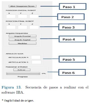 El software IBA permite visualizar las imágenes tomadas en el tomógrafo computarizado. En total se realizaron 192 cortes del volumen de la maqueta estos cortes permiten realizar la reconstrucción de la imagen en sus diferentes planos. El software está diseñado de tal forma que se pueda seguir en forma vertical los pasos para posicionar el robot. Estos pasos son seis como se muestra en la Figura 13.