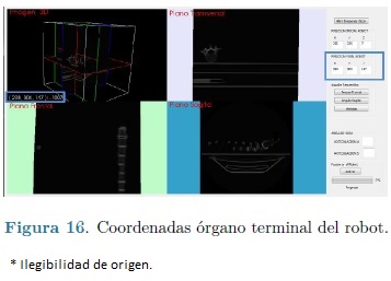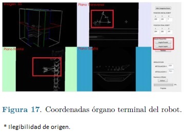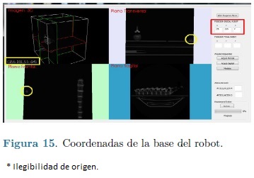 En esta imagen se empleó la herramienta de coordenadas del Plane Widget de VTK con la cual se pueden visualizar las coordenadas en x, y, z de cualquier punto de la imagen reconstruida en sus diferentes planos. Los valores visualizados se encuentran expresados en milímetros en la parte inferior izquierda de la imagen. Esta información permite ubicar la base del robot y el punto donde se desea que se desplace la punta del robot donde, lugar donde se encuentra un pequeño cilindro que sirve como guía para el instrumental.