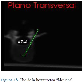 También es posible medir el tamaño del tornillo a insertar. La herramienta "Medidas" permite medir la distancia entre el pedículo y el cuerpo vertebral en milímetros permitiendo tener la certeza del tamaño ideal del tornillo a implantar. Esto se observa en la Figura 18.