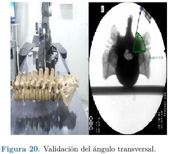 El software IBA cuenta con una, herramienta que permite sobre la imagen del plano graficar el ángulo más indicado para que el tornillo ingrese a través del pedículo sin invadir el canal vertebral como se observa en la Figura 17.
