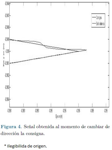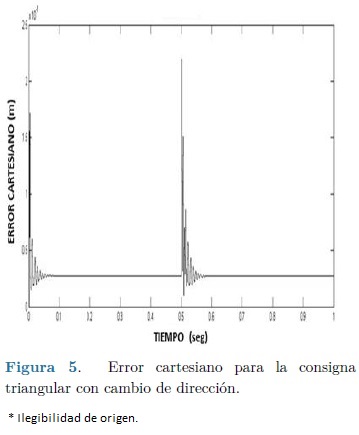 La Figura 4 muestra el error cartesiano obtenido con una consigna triangular, donde el aspecto importante para observar el comportamiento del controlador es el cambio de dirección en uno de los vértices del triángulo. Se observa el seguimiento bastante preciso que hace el PID al momento de cambiar la dirección, obteniéndose un error de máximo 2.3x10-5 metros (decenas de micras), mostrado en la Figura 5.