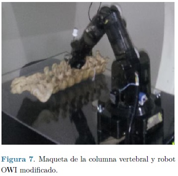 Este artículo presentó un prototipo funcional de robot para asistir en una cirugía de fijación de columna, con el fin de ayudar al cirujano en la correcta ubicación y orientación de una guía para la inserción de los tornillos en el cuerpo vertebral. Se utilizó un sencillo robot comercial de bajo costo, el cual fue modificado con el fin de proveerle un grado de libertad adicional, para un total de cinco grados de libertad. Se utilizó un tomógrafo computarizado el cual obtiene imágenes en formato Dicom de una columna vertebral real. El software desarrollado, llamado IBA, permite mostrar en pantalla la imagen en tres dimensiones de las vértebras de la maqueta realizada, pudiéndose definir el punto inicial y el punto final de la inserción del tornillo transpedicular. Realizando sencillos ajustes en el software es posible que el robot modificado, el cual está ubicado y referenciado al lado de la columna vertebral, se mueva frente a la vértebra en cuestión, mostrando al cirujano por medio de un anillo fijado a su órgano terminal, la posición y orientación guía para que él pueda introducir el tornillo.