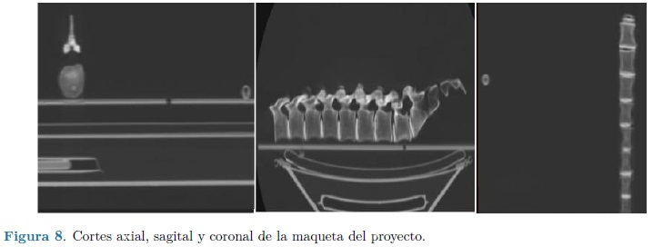 La maqueta es llevada a un tomógrafo General Electric, modelo CTE Dual, del Centro de Imágenes de Occidente, de la ciudad de Popayán, Colombia. La maqueta contiene una porción de columna real compuesta por 5 vértebras lumbares, 2 torácicas y el sacro. La siguiente figura 6 muestra la maqueta y el indicador de referencia para la base del robot.