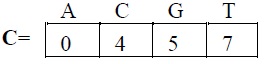 La complejidad temporal del mismo puede mejorarse si en lugar de almacenar un vector de rangos se almacena la matriz de ocurrencia O, en cada fila de tal matriz se guarda un entero para cada carácter del alfabeto igual al número de veces que el carácter ha aparecido en L, hasta ese número de fila e incluida esta, lo anterior puede observarse en la Figura 9. Ahora en lugar de escanear la última columna, simplemente se busca el carácter apropiado en los extremos izquierdo y derecho del rango actual, si no hay diferencias entre las dos búsquedas, el carácter no ocurre. Si hay una o más ocurrencias del carácter, la búsqueda dará los rangos de esas ocurrencias.