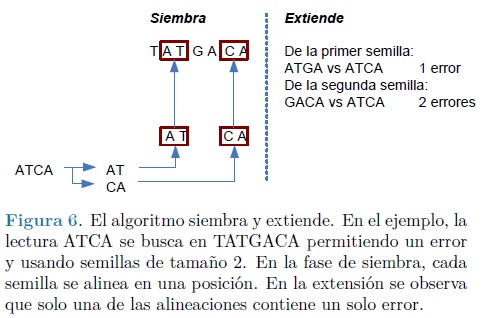 El algoritmo previo puede modificarse para alinear lecturas permitiendo errores (desapareos e indels). Suponga que se permiten dos errores durante la alineación, en tal caso se puede asegurar que a lo mucho dos de los k- mers en que se ha dividido la lectura contendrán errores y el resto de estos no los contendrán, alineándose en forma exacta al genoma (ver Figura 6), lo anterior se conoce como el principio de las cajas o del palomar. Los k - mers que se alinean perfectamente al genoma constituyen una "semilla", y al aplicar un algoritmo más preciso como los basados en programación dinámica en la vecindad de esta semilla, es posible alinear la lectura conteniendo errores. Esta estrategia de dos pasos llamada "siembra y extiende" se implementa en muchas herramientas tales como MAQ (18), PASS (19), SSAHA2 (20), SOAP (21), RMAP (22) y SeqMap (23).