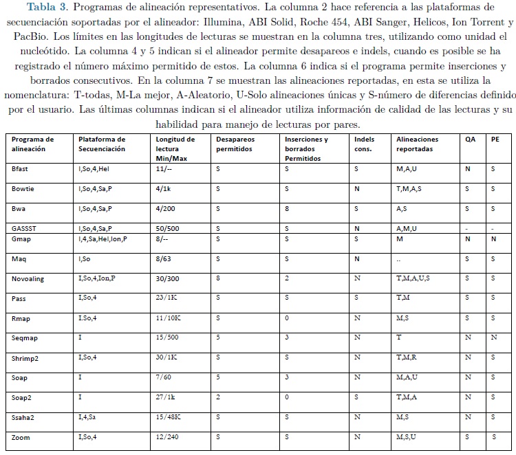 El desarrollo acelerado de las tecnologías NGS ha provocado, en los últimos años, el surgimiento de gran cantidad de software para la alineación de lecturas cortas. Al respecto existen diferentes trabajos que han revisado y comparado desde diversos puntos de vista tales aplicaciones, el más completo es el de Fonseca y equipo (14) quienes presentan un análisis comparativo de 60 programas de este tipo. Otros trabajos como los de las referencias (15), (16) y (17), limitan el estudio a un pequeño subconjunto de tales programas (los más utilizados y referenciados al momento de escribir cada artículo), pero analizándolos en forma más profunda. En realidad, es difícil poder aseverar que un programa sea mejor que otro, cada uno muestra características particulares que lo hace apropiado a determinada plataforma de secuenciación (illumina, Roche 454, etc.), o a un tipo de dato específico (ADN, bisulfito, miARN, ARN, etc.). También difieren en la forma en que reportan los resultados de la alineación, el número de desapareos, inserciones y supresiones (indels) permitidas, la habilidad de permitir indels consecutivos, la capacidad de alinear lecturas apareadas (PE), el uso de información de calidad (QA), entre otras variantes. La Tabla 3 resume las características de los programas de alineación más representativos en la actualidad.