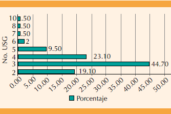 El promedio de ultrasonidos realizados durante el embarazo fue de 3.37 ± 1.14. En 80% de las pacientes (n = 160) se efectuaron tres o más ecografías. Figura 1