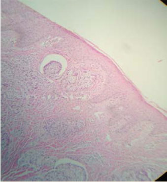 Figura 3 Nidos compactos de células neoplásicas rodeadas por un espacio claro de retracción estromal que infiltra la dermis superficial.