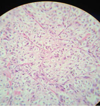 Figura 4 Células neoplásicas dispuestas en nidos, citoplasma granular, núcleo prominente y figuras mitósicas atípicas.