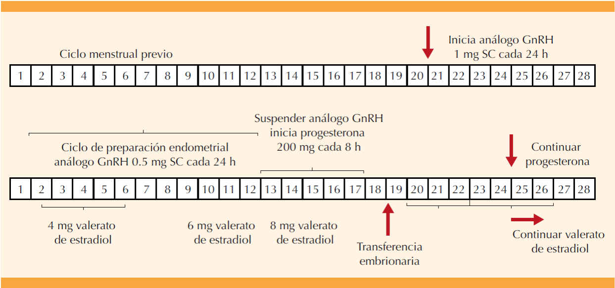 La transferencia embrionaria puede llevarse a cabo en un ciclo natural (idealmente en las pacientes con ciclos menstruales regulares de 28 a 32 días) o en un ciclo de preparación endometrial, con suplemento farmacológico de estrógenos y progesterona, incluidos los agonistas de GnRH para prevenir el pico prematuro de LH y ayudar a la sincronización del crecimiento endometrial.7