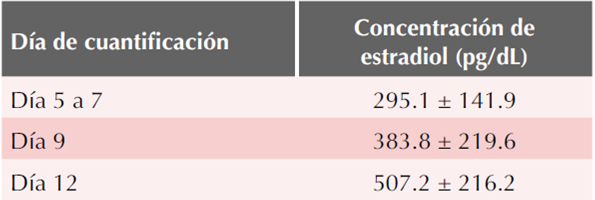 A todas las pacientes se les realizó cuantificación del nivel de estradiol durante la fase de complementación previa a la transferencia embrionaria, siendo la media de éste entre el día 5 a 7 del ciclo de 295.1 ± 141.9 pg/dL, en el día 9 de 383.8 ± 219.6 pg/dL y en el día 12 de 507.3 ± 216.2 pg/dL. Cuadro 2