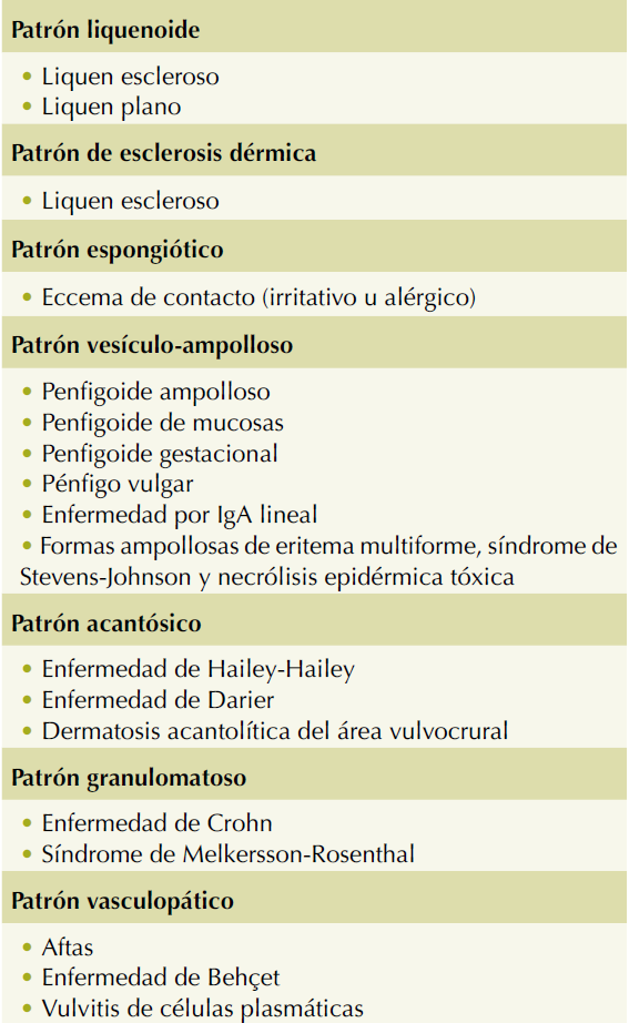 La vulva, al igual que el resto de la piel, puede afectarse por múltiples enfermedades de diferente etiopatogenia. El prurito, dispareunia y sensación de ardor o sequedad vulvar son signos comunes en diversas enfermedades; por tanto, es importante efectuar una buena correlación clínico-histológica para establecer el diagnóstico correcto.2