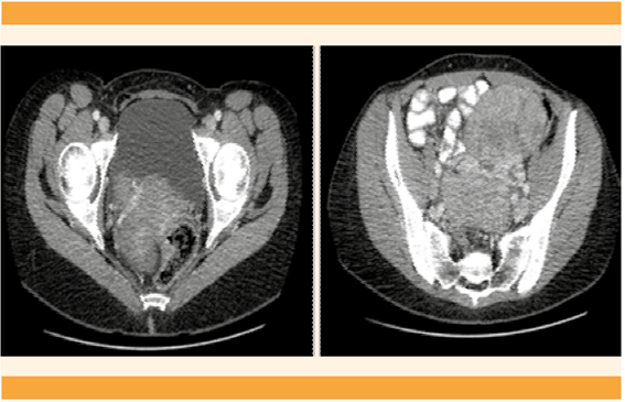 A los 6 meses de la intervención quirúrgica la paciente ingresó al servicio de Urgencias por fiebre y dolor invalidante en la fosa renal derecha. La ecografía renal reportó: hidronefrosis grado III, secundaria a uropatía obstructiva en el segmento proximal del uréter derecho, que precisó nefrostomía percutánea. Un mes después reingresó al servicio médico por un cuadro de malestar general, pérdida de peso y vómito de contenido biliar. La TAC de urgencia evidenció obstrucción intestinal de posible origen adherencial, implantes peritoneales compatibles con metástasis, engrosamiento de la pared del recto y líquido peritoneal en cantidad moderada, por lo que se prescribió tratamiento conservador con laxantes, nutrición parenteral y colocación de sonda nasogástrica, además de docetaxel.