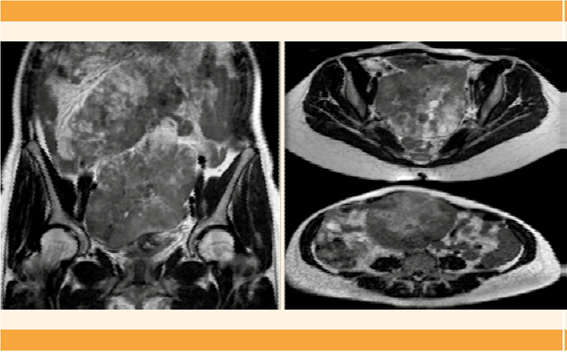 El tratamiento se inició con epirrubicina, oxaliplatino y capecitabina durante seis ciclos, cambiando a terapia combinada con ácido folínico, fluorouracilo e irinotecán por trombopenia resistente al tratamiento anterior, hasta completar 9 ciclos en total. Para la valoración de rescate quirúrgico de la enfermedad después de 10 meses de tratamiento con reacción satisfactoria, se decidió solicitar una tomografía por emisión de positrones (PET) y una resonancia magnética (RNM), como primera opción (Figura 2). Esos estudios evidenciaron persistencia de las masas ováricas, aunque con bajo grado de proliferación celular, sin signos de invasión a estructuras adyacentes, mínimo engrosamiento gástrico y ausencia de adenopatías locorregionales, por lo que se decidió valorar la posibilidad de ooforectomía bilateral con gastrectomía y peritonectomía, además de quimioterapia hipertérmica intraperitoneal.