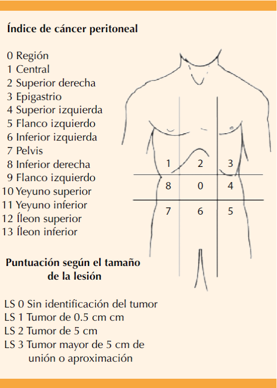 La resonancia magnética y la tomografía por emisión de positrones son técnicas útiles, sobre todo para la estadificación y valoración prequirúrgica, además del seguimiento posquirúrgico.8 La resonancia magnética es más sensible para establecer el diagnóstico de metástasis de tejidos sólidos (principalmente las de origen hepático) y para obtener resultados más precisos en pacientes con índices de carcinomatosis peritoneal más bajos en el estudio preoperatorio.8 Una de las ventajas de la tomografía por emisión de positrones es que permite efectuar estudios más extensos para el diagnóstico de tumoraciones o metástasis extraabdominales.8 De cualquier forma, ambas técnicas son útiles para el seguimiento posquirúrgico y valoración preoperatoria en pacientes idóneas para cirugía radical y quimioterapia hipertérmica intraperitoneal.8 En nuestro caso, se implementaron ambas técnicas de imagen para establecer el diagnóstico y el estudio preterapéutico, además del seguimiento de la paciente. En mujeres con neoplasias tan agresivas, como el tumor de Krukenberg, es necesario efectuar la estadificación quirúrgica adecuada (si es posible por vía laparoscópica9) antes de iniciar las terapias disponibles actualmente. Para ello se utilizan dos clasificaciones: 1) índice de cáncer peritoneal y 2) clasificación en función de los grados de citorreducción quirúrgica.9,10 El índice de cáncer peritoneal se obtiene intraoperatoriamente, dividiendo el abdomen en 13 zonas anatómicas con 4 puntuaciones posibles: 0 (sin enfermedad residual), 1 (enfermedad residual ≤ 0.5 cm), 2 (enfermedad residual 0.5-5 cm) y 3 (enfermedad residual de ≥ 5 cm); la puntación máxima es de 39, de tal forma que cuanto mayor es el índice, peor es el resultado terapéutico obtenido y, por lo tanto, el pronóstico de la enfermedad10 (Figura 3). En la paciente de este estudio se registró la máxima puntuación después de la resección. El sistema de citorreducción quirúrgica se divide en 4 tipos: 1) CC0 (sin implantes), 2) CC1 (implantes ≤0.25 cm), 3) CC2 (implantes de 0.25-2.5 cm) y 4) CC3 (implantes ≥2.5 cm).10 Ambas valoraciones son importantes en la planificación de la quimioterapia.
