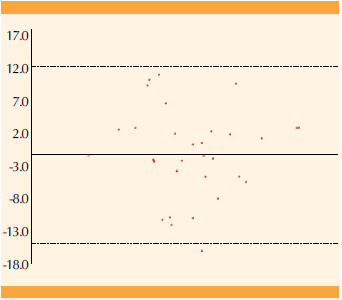 La exploración (Figura 4) reportó un sesgo de -1.3 mmHg ± 6.9 mmHg DE, lo que indica que 95% de las diferencias medias entre los métodos se observaron entre -14.8 y 12.3 mmHg (límites de acuerdo en 95%).