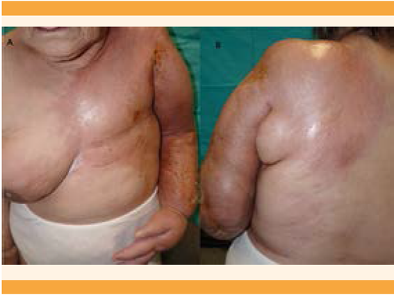 Paciente de 73 años de edad, con diagnóstico en el año 2000 de adenocarcinoma ductal infiltrante en la mama izquierda. Se trató con mastectomía total, linfadenectomía axilar, quimioterapia y tamoxifeno durante cinco años, sin recidivas. Diez años después le apareció un linfedema en el brazo izquierdo y hombro congelado. En febrero de 2017 fue remitida al servicio de Dermatología por induración progresiva y dolorosa del linfedema en el lado izquierdo del hemitórax, acompañado de disnea de reposo y síntomas constitucionales en los últimos seis meses.