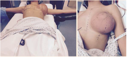 Paciente femenina de 12 años, llevada a la con-sulta debido al aumento de tamaño de la mama izquierda en el lapso de los tres meses previos. Sin antecedentes personales de importancia, sin cirugías previas, sin consumo de medicamentos y sin alergias conocidas. En la exploración física se apreció la asimetría de las mamas debido al aumento de tamaño de la izquierda; la forma de la areola y el pezón sin alteraciones (Figura 1). Se palpó una tumoración de bordes delimitados, consistencia homogénea blanda que ocupaba toda la glándula mamaria de aproximadamente 20 cm.