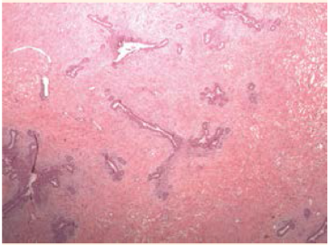 El reporte histopatológico fue de un fragmento macronodular de tejido, de 850 g y 17.0 x 16.0 x 8.0 cm, de color marrón-blanquecino, aspecto lobulado y consistencia renitente. Al corte, la sección era homogénea, de las mismas carac-terísticas descritas. Se trató de un tumor con proliferación mixta benigna, compuesta por es-troma colágeno denso, con ductos comprimidos y epitelio sin datos de atipia. No hubo evidencia de malignidad. Figura 5