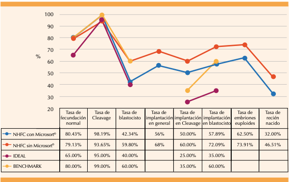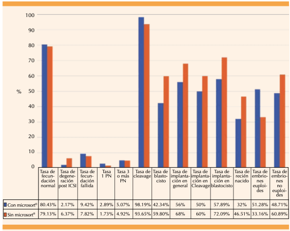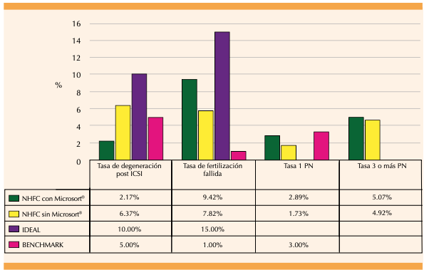 Figura 1. Comparación de los indicadores clave de rendimiento (KPI ́s) del New Hope Fertility Center (NHFC) de la Ciudad de México, con y sin el uso de Microsort®