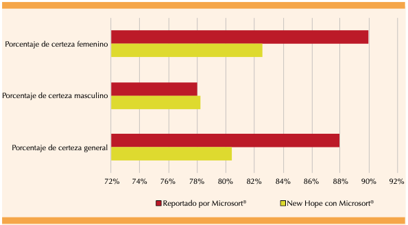 Figura 2. Comparación del porcentaje de certeza estimado en el New Hope Fertility Center (NHFC) de la Ciudad de México y lo reportado por Microsort®.