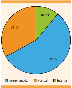 Se estudiaron 182 pacientes con media de edad de 23 años, con límites de 14 y 43 años. El grado de escolaridad fue: primaria con 39.1% (n = 71), secundaria con 35.7% (n = 65) y bachillerato con 25.2% (n = 46). En cuanto a ocupación, las labores del hogar representaron 80.7% (n = 147). El estado civil fue unión libre en 78% (n = 142) seguido de casadas en 22% (n = 40). (Figura 1). El 52.7% (n = 96) no recibió consejería de planificación familiar. El 52.2% (n = 95) de las usuarias utilizó un método anticonceptivo previo. El más frecuente fue el preservativo en 26.9% (n = 49) y el segundo con 18.1% (n = 33) fue el dispositivo intrauterino de TCu 380A. (Figura 2). Los recién nacidos de término representaron 83% (n = 151), 6.1% (n = 11) los pretérmino y 10.9% (n= 20) abortos. El momento más frecuente de colocación del dispositivo fue en el posparto con 47.3% ( n = 86), transcesárea 20.9% (n = 38), antes del alta hospitalaria 20.9% (n = 38) y en el posaborto 10.9% (n = 20). La técnica de colocación más utilizada fue la instrumentada en 56.0% (n = 102) de los casos, manual en 33% (n = 60) y con aditamento para insertar 11% (n = 20). (Figura 4) La aplicación de los dispositivos la realizaron: residentes de primer grado 41.7% (n = 76), residentes de segundo grado 29.6% (n = 54), residentes de tercer grado 8.2% (n = 15), residentes de cuarto grado 1.1% (n = 2), internos de pregrado 17.0% (n = 31), y médicos adscritos 2.2% (n = 4). En 49.4% (n = 90) de los casos la inserción del dispositivo fue supervisada por los mismos médicos residentes, en 41.2% (n = 75) sin supervisión, y solo 9.3% (n = 17) de los procedimientos fueron supervisados por médicos adscritos. Solo 71.4% (n = 130) de las pacientes acudió a su cita subsecuente a las cuatro semanas. En el seguimiento de la permanencia del dispositivo TCu 380A, el 42.31% (n=77) se encontró "in situ", 28.5% (n=52) en mala posición, 28.5% (n=52) no acudió a revisión y 0.55% (n=1) lo expulsó. (Figura 5).