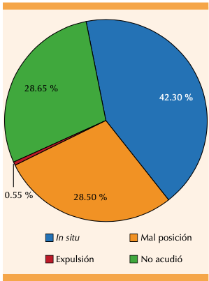 Se incluyeron 182 pacientes con media de edad de 23 años y límites de 14 y 43 años. En el seguimiento de la permanencia del dispositivo 42.3% (n = 77) se encontró in situ, 28.5% (n = 52) en mala posición, y 0.55% (n = 1) lo expulsó.
