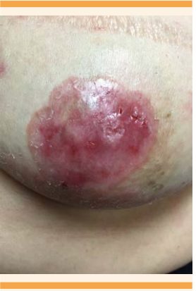 Mujer de 69 años, con antecedentes médicos de colecistectomía complicada dos años antes y colocación de endoprótesis biliar; antecedentes heredofamiliares: padre con cáncer pulmonar y madre con cáncer renal. En el interrogatorio refirió que el padecimiento actual se inició cuatro años antes, con cambios en la coloración del pezón y descamación, acompañados de prurito. Se le prescribieron corticoesteroides tópicos sin disminución de los síntomas. Posteriormente manifestó una dermatosis localizada en la glándula mamaria izquierda, que afectaba el pezón y la areola. La lesión era unilateral y asimétrica, constituida por una placa con eritema y descamación fina, de 4.0 x 4.5 cm de diámetro, con retracción del pezón (Figura 1).