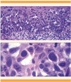 Figura 2. Epidermis con nidos de células atípicas y citoplasma claro abundante (tinción HE: 10x y 40x).