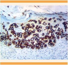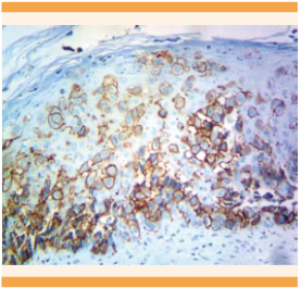 El diagnóstico de enfermedad de Paget mamaria se confirmó mediante biopsia de piel del pezón, considerado el estudio de elección, que además incluye la evaluación de los conductos galactóforos. 5 Histológicamente se caracteriza por la coexistencia de células de adenocarcinoma intraepitelial (células de Paget), por separado o en grupos, dentro de la epidermis del pezón. Las células son grandes, redondas u ovaladas, con protoplasma grueso, citoplasma pálido y claro, con núcleos grandes y nucléolos con mitosis abundantes. 1,3 La inmunohistoquímica con mayor especificidad es la citoqueratina 7. La oncoproteína c-erb2 suele sobreexpresarse en más de 90% de los casos y la tinción positiva casi siempre se relaciona con carcinoma de mama. 2)