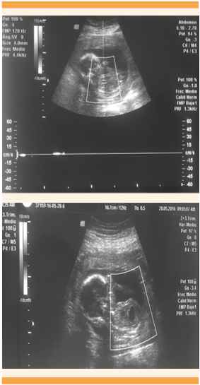 Mujer de 42 años, sin antecedentes personales patológicos de importancia para el padecimiento actual; antecedentes ginecoobstétricos: 4 embarazos, 3 partos, amenorrea tipo II, con embarazo de 20.2 semanas de gestación establecido por ultrasonido en el primer trimestre. Acudió al servicio de Urgencias del Hospital Integral de la Mujer de Sonora por dolor pélvico de tipo opresivo, de inicio progresivo, con irradiación a la espalda, de 24 horas de evolución. Síntomas concomitantes: vómito de contenido alimenticio posterior al consumo de colecistocinéticos en tres ocasiones. Signos vitales: tensión arterial 90-100 mmHg, frecuencia cardiaca 68, temperatura 35.8 °C, frecuencia respiratoria 19, peso 70 kg, talla 1.68 m, e IMC 24.8. A la exploración física se encontró tranquila, consciente, orientada en las tres esferas; buen estado de hidratación; piel y tegumentos con adecuada coloración; estado cardiopulmonar sin afectación, ruidos cardiacos rítmicos, con buena intensidad y frecuencia; glándulas mamarias simétricas, pendulantes; abdomen globoso a expensas de útero gestante, con fondo uterino de 17 cm; frecuencia cardiaca fetal de 145 latidos por minuto; el resto del abdomen con signo de Murphy positivo, tacto vaginal con cuello corto, cerrado, cérvix central, sin pérdidas transvaginales; extremidades eutróficas, sin datos de edema, reflejos osteotendinosos normales y perfusión distal adecuada. Los estudios de laboratorio reportaron leucocitosis de 22.4/µL y hemoglobina de 10.7 g/dL. El ultrasonido obstétrico reportó un feto vivo, de 21 semanas de gestación, con adecuado líquido amniótico, placenta I-II y frecuencia cardiaca de 151 por minuto. Figura 1